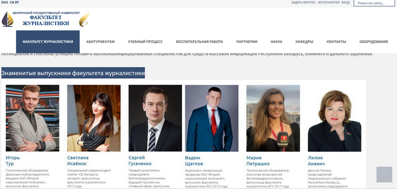 У абноўленай рубрыцы «Знакамітыя выпускнікі» сайта журфака БДУ зараз спрэс адыёзныя прапагандысты і чыноўнікі — Ігар Тур, Марыя Пятрашка, Лілія Ананіч і іншыя.