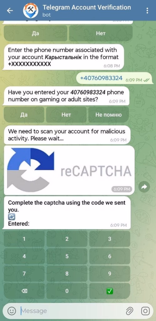 Дальше бот предлагает указать телефон, к которому привязан аккаунт.